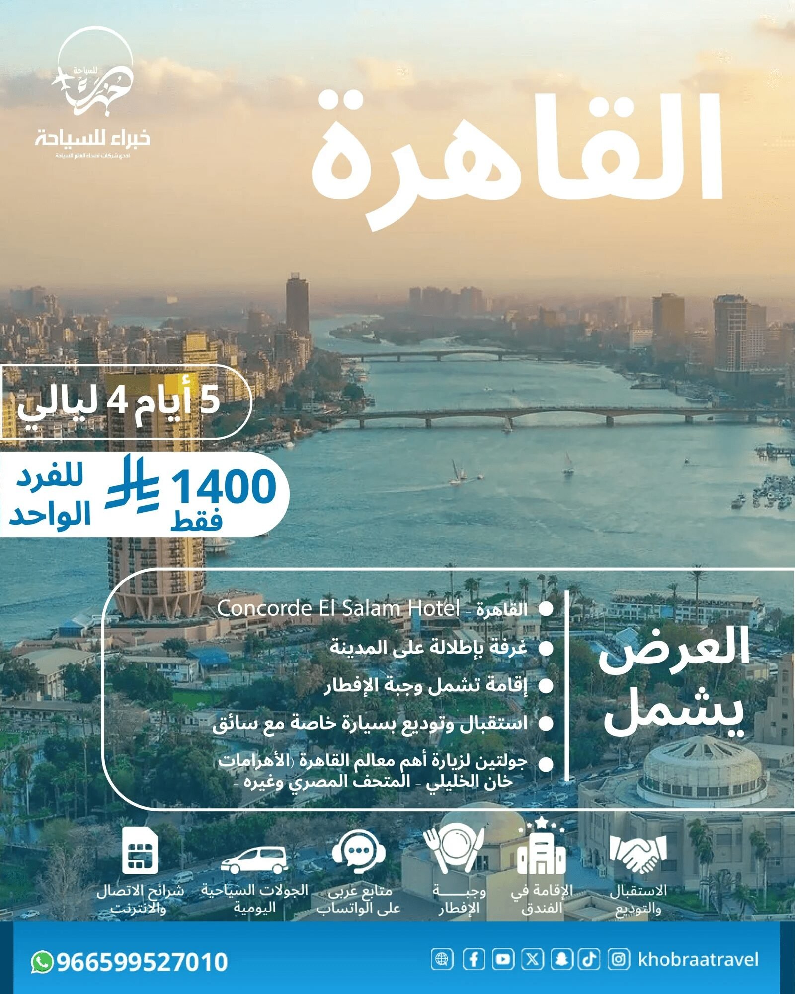 صممت خبراء للسياحة برنامج سياحي إلى القاهرة 5 أيام 4 ليالي لتأخذكم في رحلة ساحرة للغوص في أعماق كنوز المدينة بين عظمة الأهرامات وكنوز المتحف المصري والأسواق التقليدية الصاخبة والتجول في شوارعها الإسلامية، ومعنا يمكنك الاستمتاع برحلة مثالية شاملة الخدمات الأساسية التي تحتاج إليها بدايةً من تخطيط منظم لجولات شاملة، إقامة وتنقلات مريحة، خدمة عملاء للتواصل على مدار الساعة.